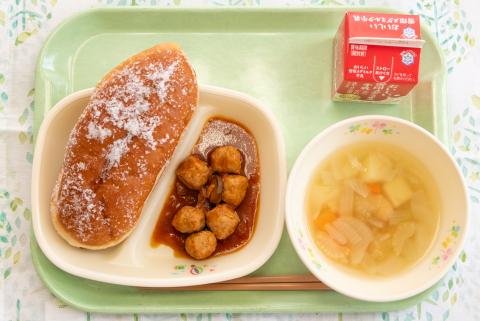 今日のパンはあぶらパンです。給食のあぶらパンは、パン屋さんと給食センターが力を合わせて作っています。まず、パン屋さんが朝早くからパンを焼き、給食センターまで届けてくれます。そして、そのパンを給食センターで揚げて、砂糖をまぶして完成です。油で揚げると、中はふわっとしてやわらかくなり、表面はカリッとした食感になります。食感を楽しんで食べてください。