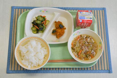 きゅうりは、みそ、しょうゆ、塩、酢など日本の調味料との相性がよく、漬け物や酢の物などで昔から親しまれてきました。夏が旬の野菜ですが、今では一年中食べられるようになりました。ほとんどが水分で、さっぱりと口の中を洗ってくれるような独特の食感が魅力です。今日は、酢の物にしました。食感を楽しんで食べてください。