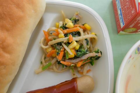 今日は、福崎町の特産のもち麦麺を使ったサラダです。もち麦麺は、独特の香ばしさがあり、見た目はそばのようですが、食べるともちもちとした食感で、うどんのようなコシがあります。暑い夏には冷やして、寒い冬には温かい汁にして食べます。今日は、冷たいサラダにしています。もち麦の香ばしさと麺のコシを楽しんでください。