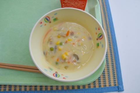 コーンポタージュは、クリームコーンとホールコーンの2種類のコーンを使っています。クリームコーンは、とうもろこしの粒を切り落とし、ミキサーでつぶしてクリーム状にし、塩、砂糖、でん粉などを加えて作ったもので、ホールコーンは、粒のままのものです。コーンの食感の違いを楽しみましょう。