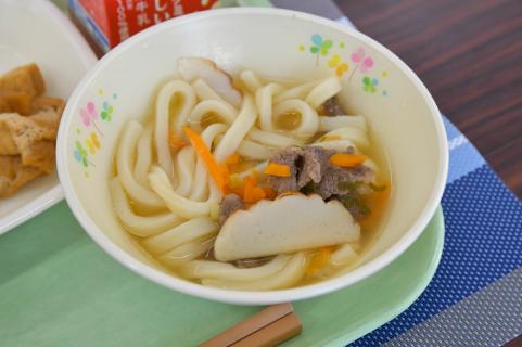 今日はうどんにかまぼこが入っています。かまぼこは、魚の身をすりつぶした「すりみ」に塩やさとうなどの調味料を混ぜ、板につけて蒸したり焼いたりしたものです。魚の保存性を高めるだけでなく、魚をよりおいしく食べるために生まれました。ハモやスケトウダラなどの白身魚がよく使われます。