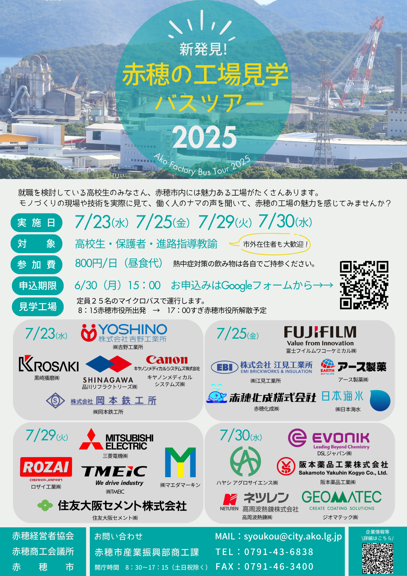 新発見!赤穂の工場見学バスツアー2025参加高校生等を募集します
