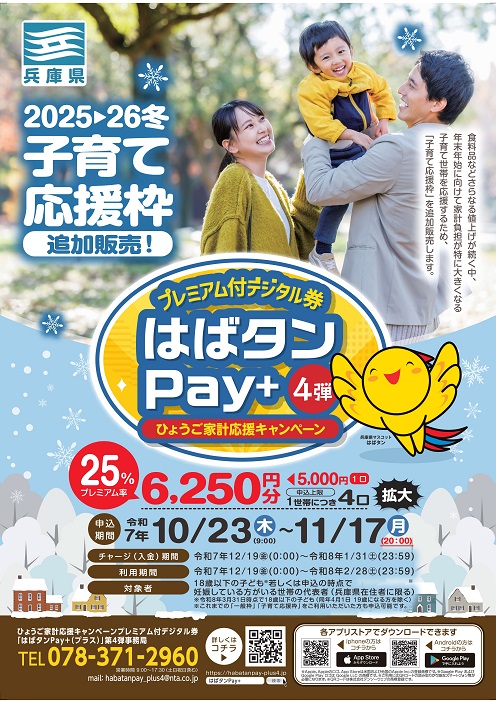 長引く物価高騰の影響が特に大きい子育て世帯を応援するため、兵庫県が実施するプレミアム付デジタル商品券事業「はばタンPay+」第4弾の子育て応援枠を追加販売します。