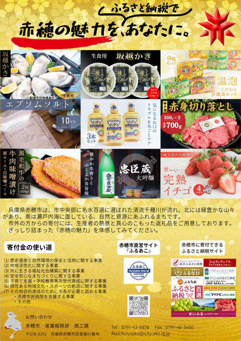 赤穂市では、「ふるさとづくり寄付金」(ふるさと納税)の推進と地域振興を図ることを目的に、市外にお住まいの個人の方が、ふるさとづくり寄付金制度により、赤穂市に寄付をしていただいた場合に、地元企業や地元事業者等が取り扱う商品やサービスを特産品等として贈呈いたします。