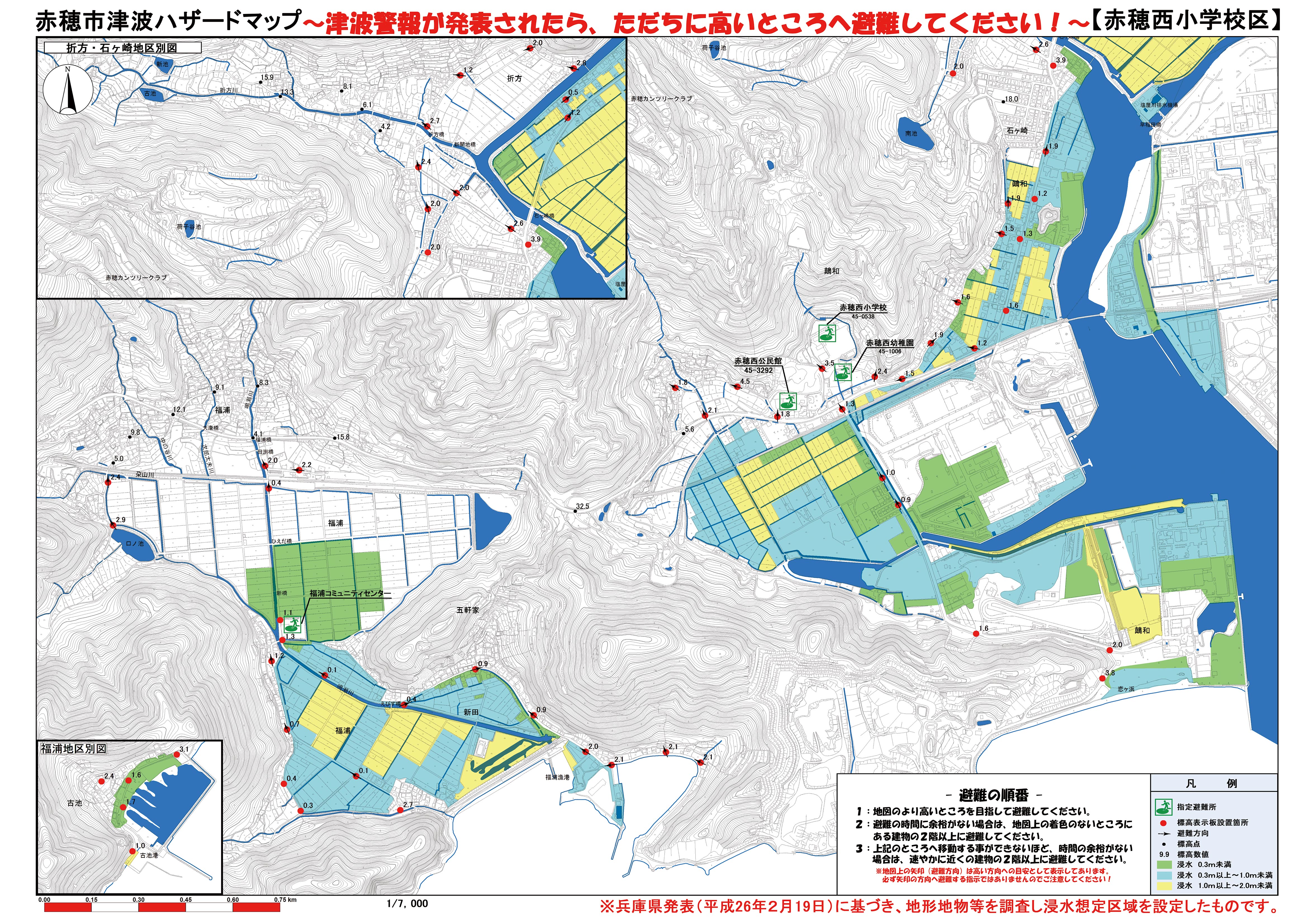 平成26年2月19日兵庫県発表の南海トラフ巨大地震による津波浸水想定区域に基づき、赤穂市全域図と10の小学校区に分割した区域図を作成しています。