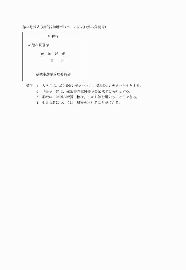 第57条 法第201条の9(都道府県知事又は市長の選挙における政治活動の規制)第1項第4号のポスター(以下「政治活動用ポスター」という。)につき、委員会は同法第201条の11(政治活動の態様)第4項の規定により証紙を交付するものとし、その様式は別記第44号様式による。