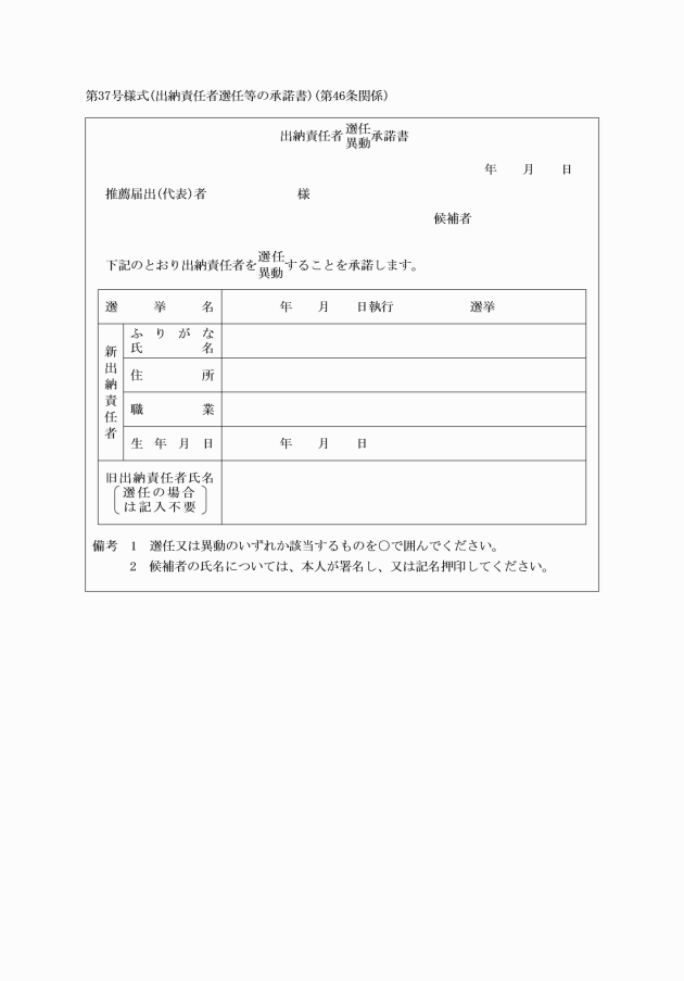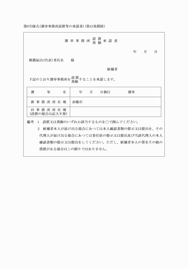 第15条 法第130条(選挙事務所の設置及び届出)第2項の規定による選挙事務所の設置又は異動の届出は、別記第7号様式に準じてしなければならない。