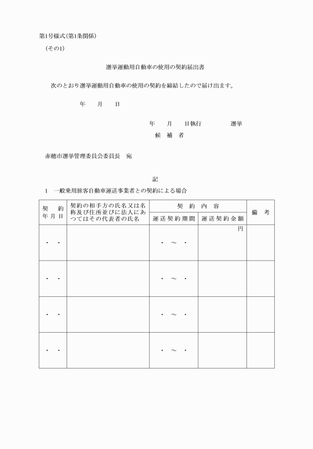 第1条 赤穂市議会議員及び赤穂市長の選挙における選挙運動用自動車の使用の公営に関する条例(平成5年赤穂市条例第11号。以下「自動車条例」という。)第2条又は赤穂市議会議員及び赤穂市長の選挙における選挙運動用ポスターの作成の公営に関する条例(平成5年赤穂市条例第12号。以下「ポスター条例」という。)第2条の規定の適用を受けようとする者は、自動車条例第3条又はポスター条例第3条に規定する有償契約を締結した場合には、直ちに(立候補の届出前に当該契約を締結した場合には、立候補の届出後直ちに)、当該契約に関する書面の写しを添えて、自動車条例第3条又はポスター条例第3条の規定による届出をしなければならない。