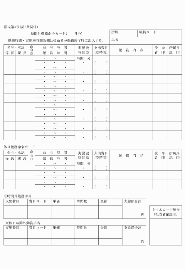 第5条 事務の繁忙なとき、若しくは急を要する用務のため、赤穂市職員の勤務時間その他の勤務条件に関する条例(昭和40年赤穂市条例第18号。以下「条例」という。)にいう休日、又は勤務を要しない日、若しくは正規の勤務時間をこえて勤務を命ぜられたときは、電子システムにより決裁を受けなければならない。ただし、電子システムにより難い場合は、時間外等勤務命令カード(様式第4号)により決裁を受けなければならない。