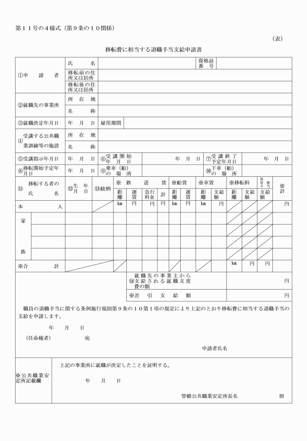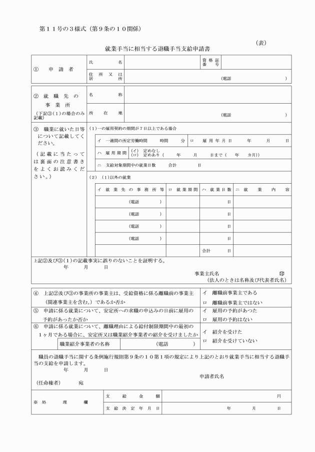 第9条の10 受給資格者又は条例第12条第15項に規定する者は、同条第11項第4号から第6号までの規定による退職手当の支給を受けようとするときは、同項第4号の規定による退職手当にあつては就業促進手当に相当する退職手当支給申請書(第11号の3様式)に、同項第5号の規定による退職手当にあつては移転費に相当する退職手当支給申請書(第11号の4様式)に、又は同項第6号の規定による退職手当のうち雇用保険法第59条第1項第1号に該当する行為をする者に係る求職活動支援費に相当する退職手当にあつては求職活動支援費(広域求職活動費)に相当する退職手当支給申請書(第11号の5様式)に、同項第2号に該当する行為をする者に係る求職活動支援費に相当する退職手当にあつては求職活動支援費(短期訓練受講費)に相当する退職手当支給申請書(第11号の6様式)に、同項第3号に該当する行為をする者に係る求職活動支援費に相当する退職手当にあつては求職活動支援費(求職活動関係役務利用費)に相当する退職手当支給申請書(第11号の7様式)に、それぞれ受給資格証、高年齢受給資格証又は特例受給資格証を添えて市長に提出しなければならない。ただし、受給資格証、高年齢受給資格証又は特例受給資格証を提出することができないことについて正当な理由があるときは、これを添えないことができる。