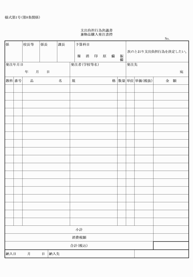 第8条 校長等は、所属予算配当等及び教育課程の編成を考慮して翌月の物品需給の見積り(以下「需給計画」という。)をたて、毎月末までに支出負担行為決議書兼物品購入発注書控(以下「支出負担行為決議書」という。)(様式第1号)を担当課に送付しなければならない。