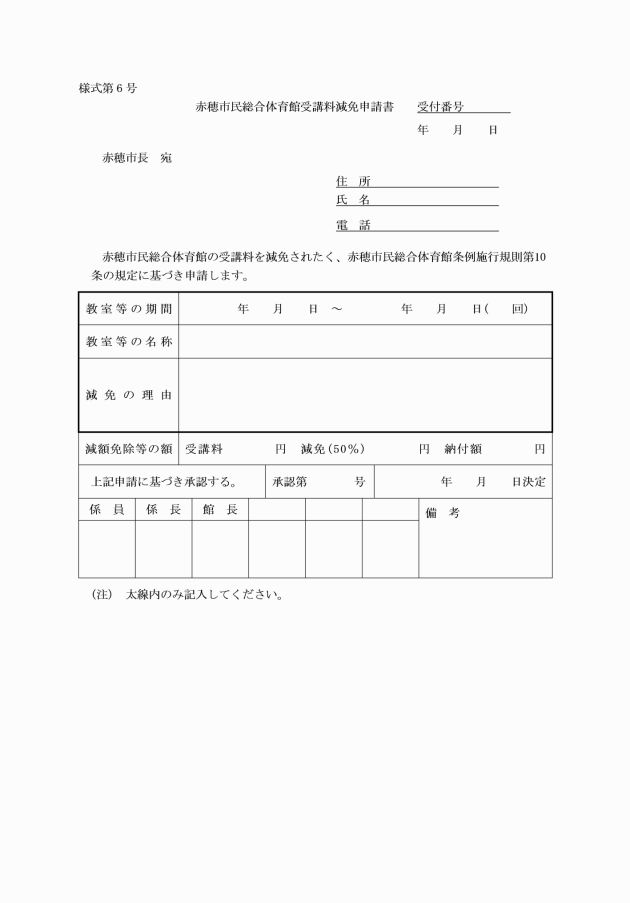 受講料 | 身体障害者(児)、知的障害者(児)、精神障害者(児)、その他特別の理由により市長が特に必要と認めた場合 | 100分の50 |