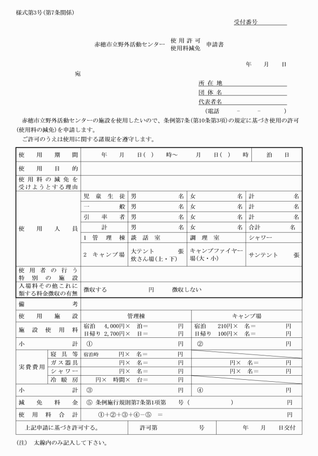 第5条 教育委員会が野外活動センターの使用を許可したときは、赤穂市立野外活動センター使用許可書(様式第2号。以下「使用許可書」という。)を交付する。