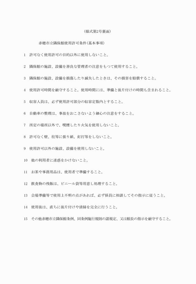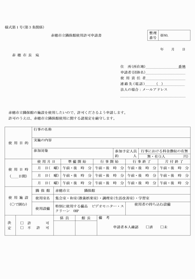 第3条 隣保館の使用許可を受けようとする者は、使用の日の前日までに隣保館使用許可申請書(様式第1号)を市長に提出し、その許可を受けなければならない。