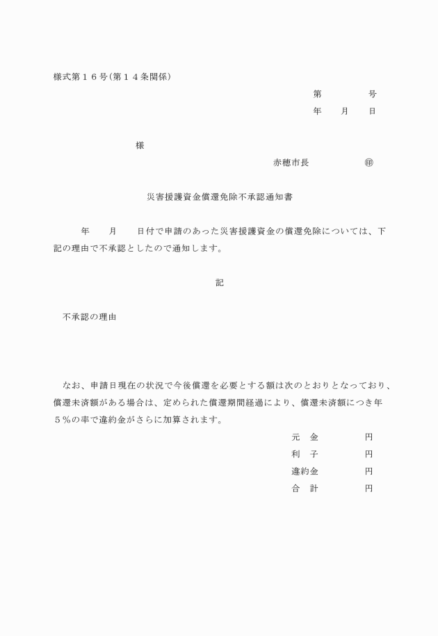第14条 資金の償還未済額の全部又は一部を償還の免除を受けようとする者(以下「償還免除申請者」という。)は、災害援護資金償還免除申請書(様式第14号)を、市長に提出しなければならない。