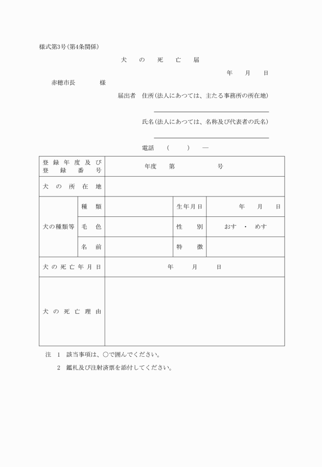 第4条 規則第8条第1項の規定により犬の死亡の届出をしようとする者は、犬の死亡届(様式第3号)によらなければならない。