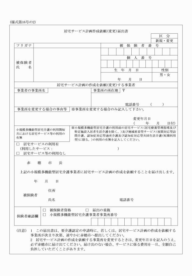 第22条 省令第77条第1項の規定による届書は、居宅サービス計画作成依頼(変更)届出書(様式第16号)によるものとする。