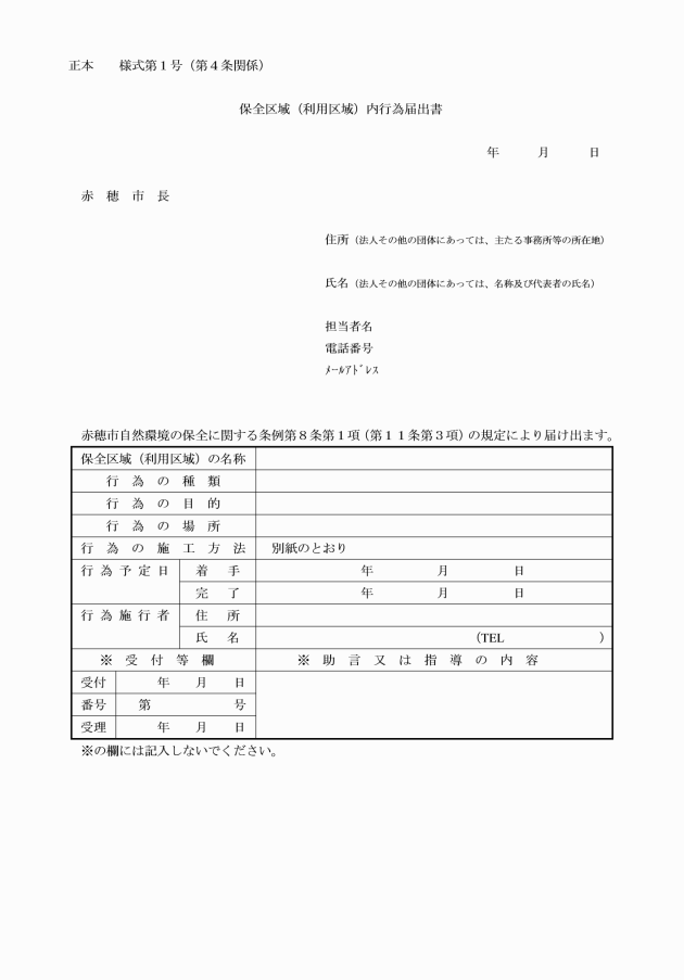 第4条 条例第8条第1項本文(条例第11条第3項において準用する場合を含む。)の規定による届出は、保全区域(利用区域)内行為届出書(様式第1号)による。