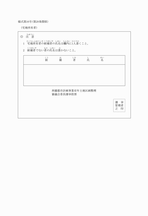 第3条 選挙人名簿は、施行地区内の宅地の所有者(以下「宅地所有者」という。)及び施行地区内の宅地について、借地権を有する者(以下「借地権者」という。)の各選挙人別にそれぞれ様式第1号により作成する。