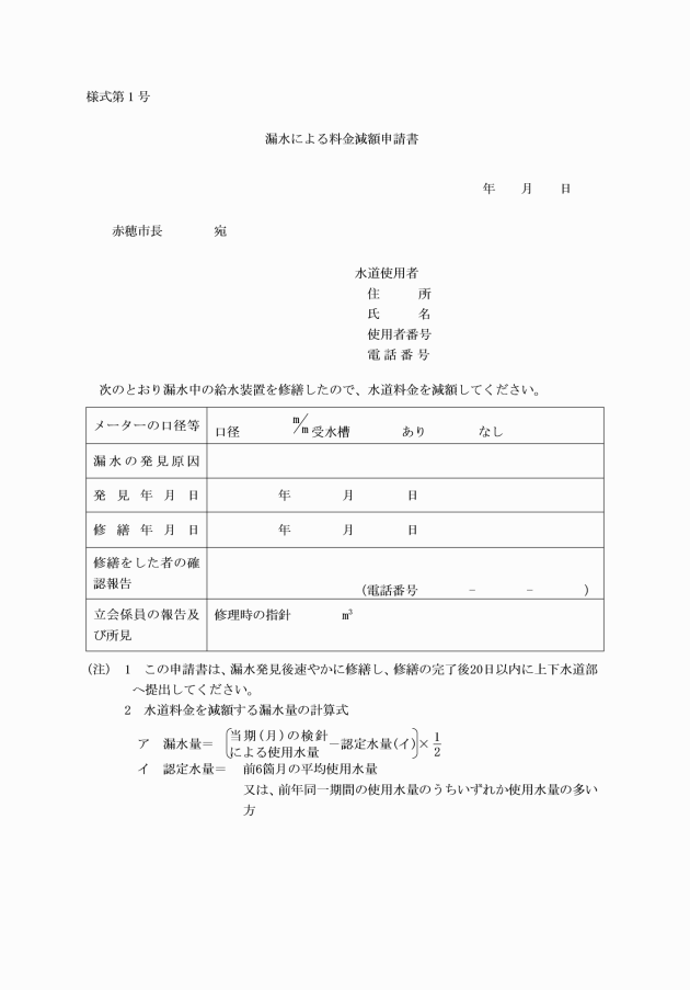 第3条 水道使用者は、給水装置の故障により漏水を生じその故障を修繕したときは、漏水による料金減額申請書(様式第1号)により料金の減額を申請することができる。