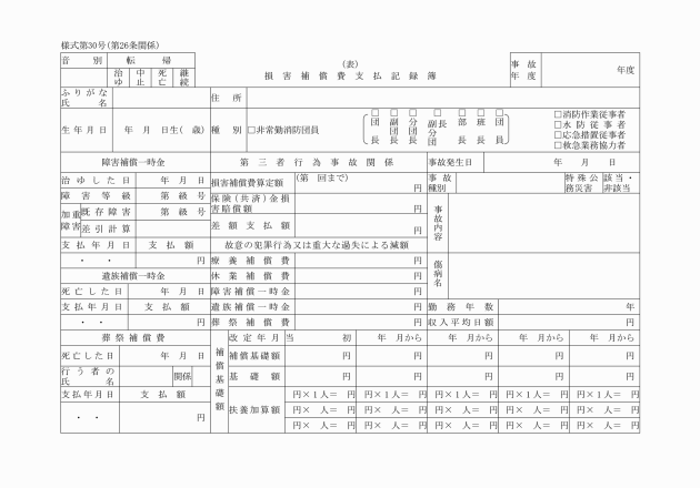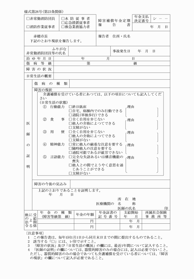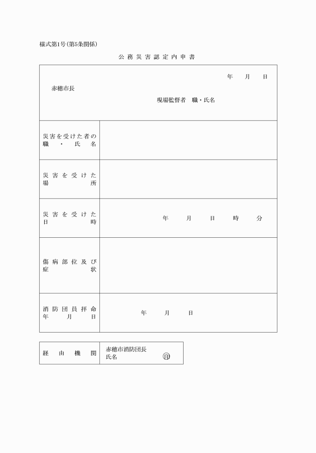 第5条 非常勤消防団員又は消防作業従事者等(以下「非常勤消防団員等」という。)が公務により、又は消防作業若しくは水防(以下「消防作業等」という。)に従事し、若しくは救急業務に協力したことにより負傷し、若しくは疾病にかかり、又は死亡したときは、現場責任者又はその代理者は、負傷若しくは疾病又は死亡の原因及び状況を詳細に調査し、非常勤消防団員の場合は、公務災害認定内申書(様式第1号)、消防作業従事者等の場合は、消防作業従事者等災害認定内申書(様式第2号)を作成し、医師の診断書、現場見取図及び負傷若しくは疾病又は死亡の原因並びに当時の状況報告書を添付し、市長に提出しなければならない。ただし、警察官、海上保安官若しくは災害派遣を命ぜられた部隊等の自衛官から従事命令を受けた応急措置従事者にあつては、本人、遺族又はそれらの代理人が当該警察官、海上保安官若しくは災害派遣を命ぜられた部隊等の自衛官が属する警察署の長、海上保安署の長若しくは災害派遣を命ぜられた自衛官の属する部隊等の長の証明書(様式第3号)に、医師の診断書を添付し、市長に提出するものとする。