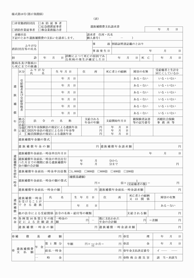 第18条 遺族補償年金を受ける権利を有する者(以下「遺族補償年金の受給権者」という。)又は遺族補償一時金を受ける権利を有する者(以下「遺族補償一時金の受給権者」という。)が2人以上あるときは、非常勤消防団員等の遺族は、これらの者のうち1人を遺族補償年金又は遺族補償一時金の請求及び受領についての代表者に選任し、遺族補償の請求及び受領についての代表者選任届出書(様式第19号)により届け出なければならない。これを解任したときも同様とする。