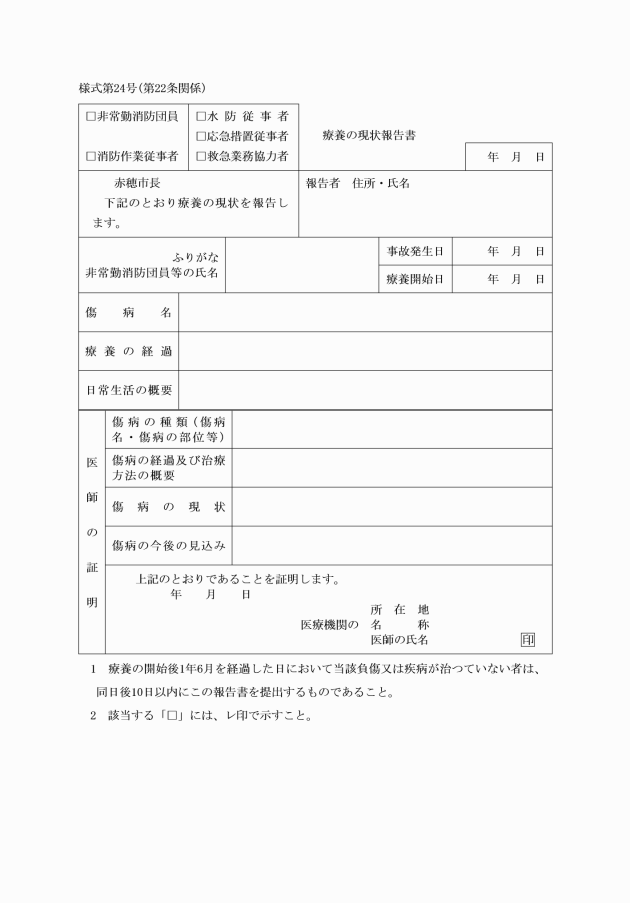 第22条 負傷又は疾病が療養補償に係る療養の開始後1年6月を経過した日において治ゆしていない者は、同日後10日以内に療養の現状報告書(様式第24号)を市長に提出しなければならない。