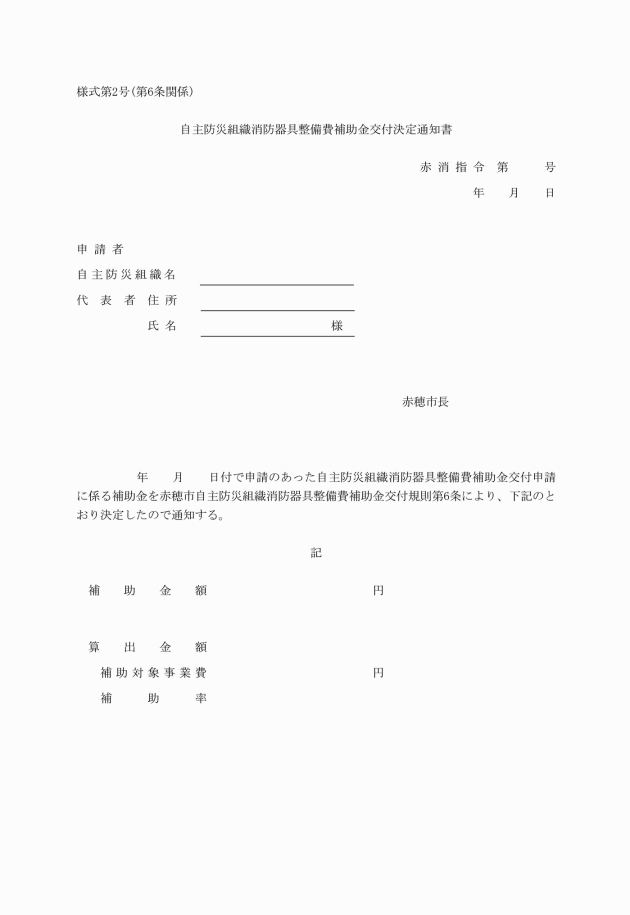 第6条 市長は、前項の規定により補助金交付の申請があつた場合は、当該申請書に係る書類の審査及び現地調査等により、補助金の交付の対象とすることが適当であると認めるときは、補助金の交付を決定し、自主防災組織消防器具整備費補助金交付決定通知書(様式第2号)を申請者に交付する。