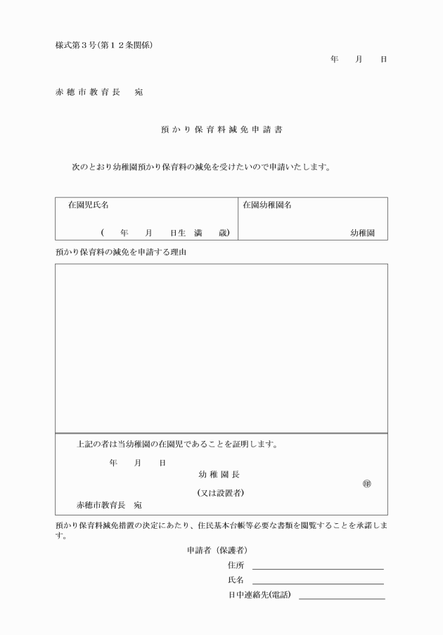 第12条 教育長は、必要があるときは、年間預かり保育料を減免することができる。