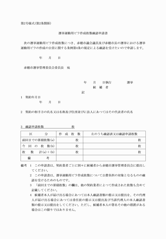 第1条 赤穂市議会議員及び赤穂市長の選挙における選挙運動用ビラの作成の公営に関する条例(平成22年赤穂市条例第1号。以下「条例」という。)第2条の規定の適用を受けようとする者は、条例第3条に規定する有償契約を締結した場合には、直ちに(立候補の届出前に当該契約を締結した場合には、立候補の届出後直ちに)、当該契約に関する書面の写しを添えて、同条の規定による届出をしなければならない。