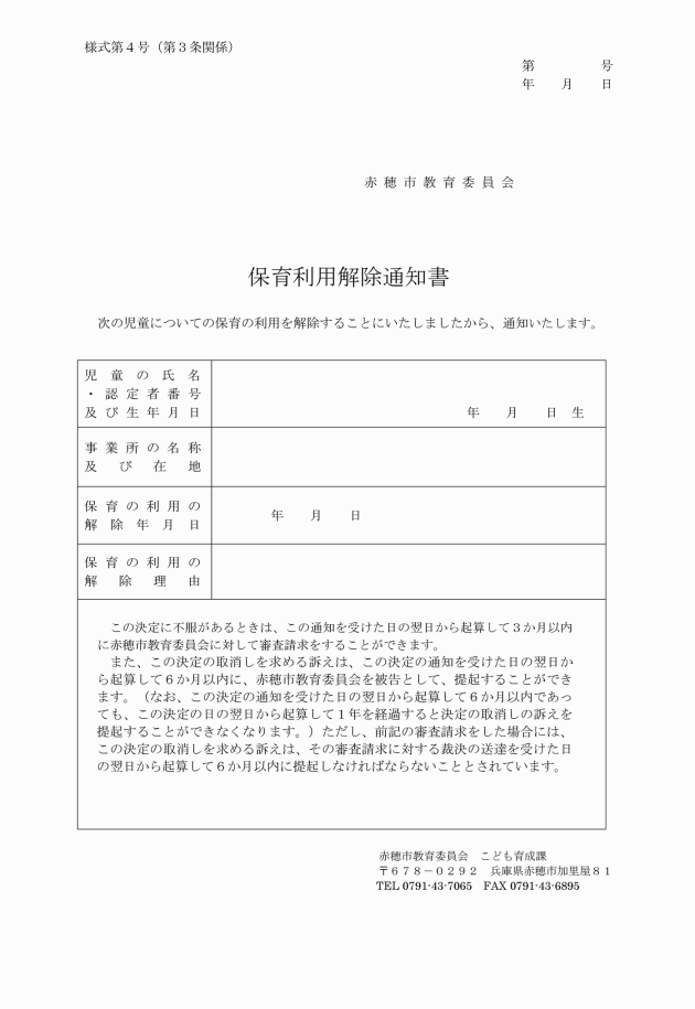 第3条 乳幼児の保育の利用を解除させようとする保護者は、保育利用解除届(様式第3号)を保育所長を経て、教育委員会に提出するものとする。