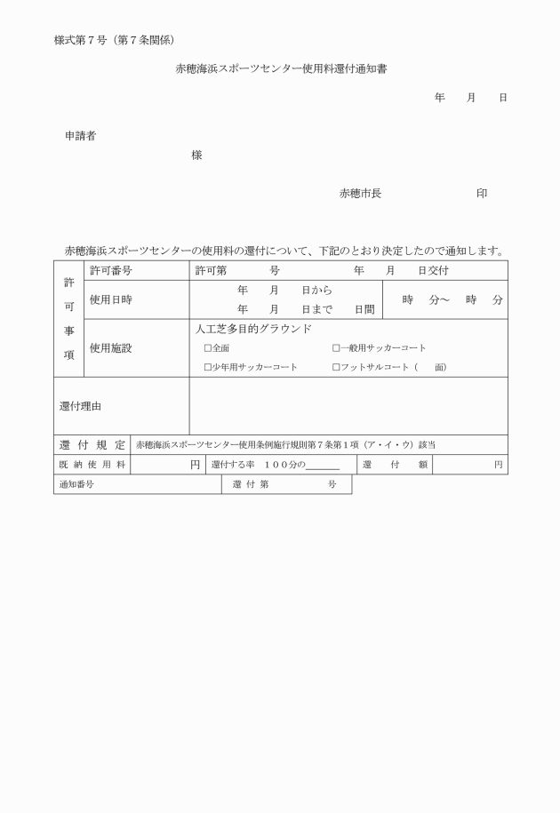 7 市長は、使用を許可するときは、条例第11条のただし書に定める場合を除き、使用料の納付があつた後、使用許可書(様式第3号)を交付する。