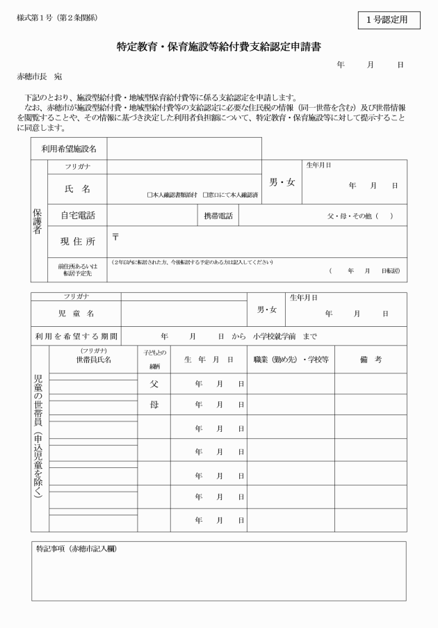 (1) 法第19条第1号に掲げる小学校就学前子どもの区分に係る認定を受けようとする者 特定教育・保育施設等給付費支給認定申請書(様式第1号)
