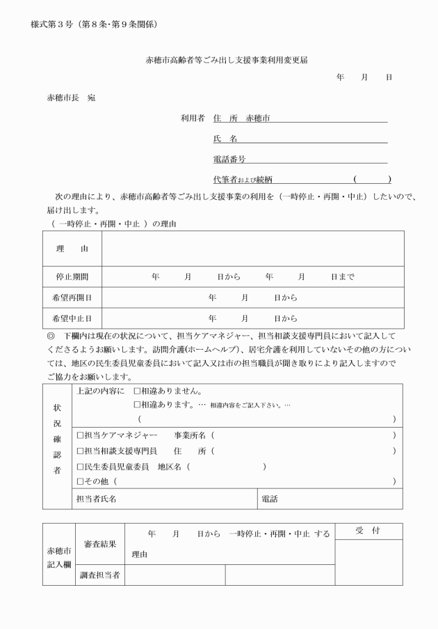 第8条 利用世帯は、入院その他の理由により、一時的に戸別収集を必要としないときは、赤穂市高齢者等ごみ出し支援事業利用変更届(様式第3号)により、市長に申し出なければならない。また、再度、戸別収集が必要となつた場合も同様とする。