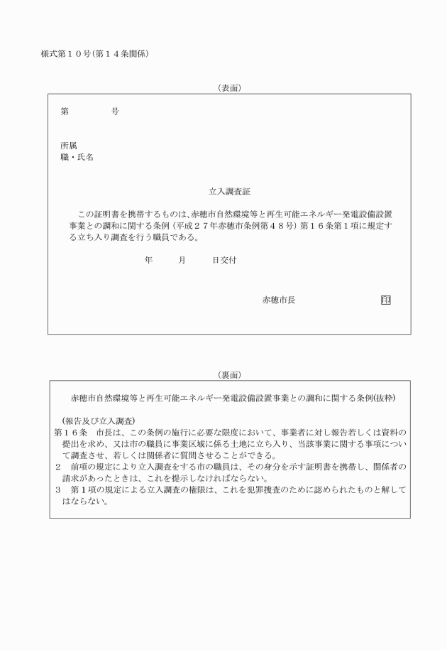 ○赤穂市自然環境等と再生可能エネルギー発電設備設置事業との調和に関する条例施行規則