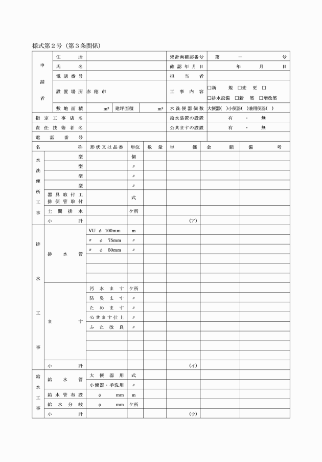 2 公共ます等は、原則として汚水が生ずる建物及び構築物の敷地並びに建築を予定している宅地に設置するものとし、その設置戸数は、1戸当たり1箇とする。ただし、公共ます等の増設を必要とする者は、公共ます等特別設置申請書(様式第7号)を管理者に提出し、これに要する費用は当該増設を必要とした者の負担とする。