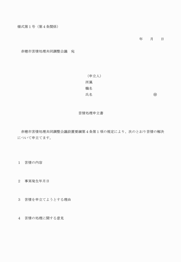 第4条 苦情を申立てようとする者(以下「申立人」という。)は、苦情処理申立書(様式第1号。以下「申立書」という。)に苦情に関する資料を添えて、人事担当課を経由して調整会議に提出しなければならない。