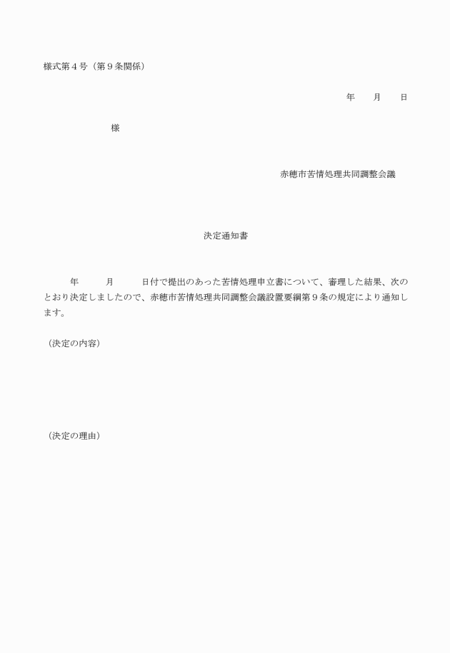 第9条 調整会議は、事案の処理を決定した場合は、7日以内に決定通知書(様式第4号)により、その内容を市長及び申立人に通知しなければならない。