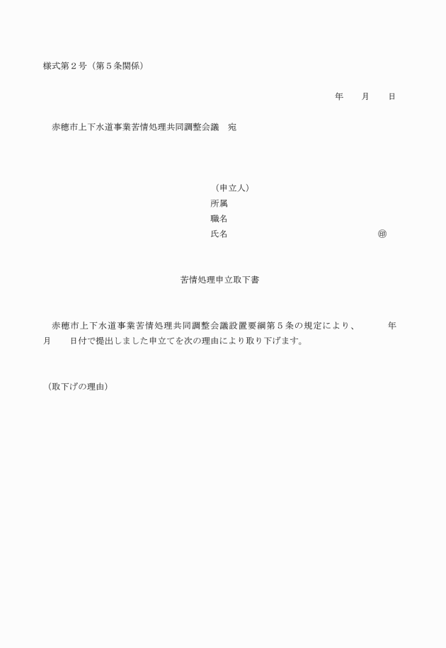 第4条 苦情を申し立てようとする者(以下「申立人」という。)は、苦情処理申立書(様式第1号。以下「申立書」という。)に苦情に関する資料を添えて、上下水道部総務課(以下「総務課」という。)を経由して調整会議に提出しなければならない。