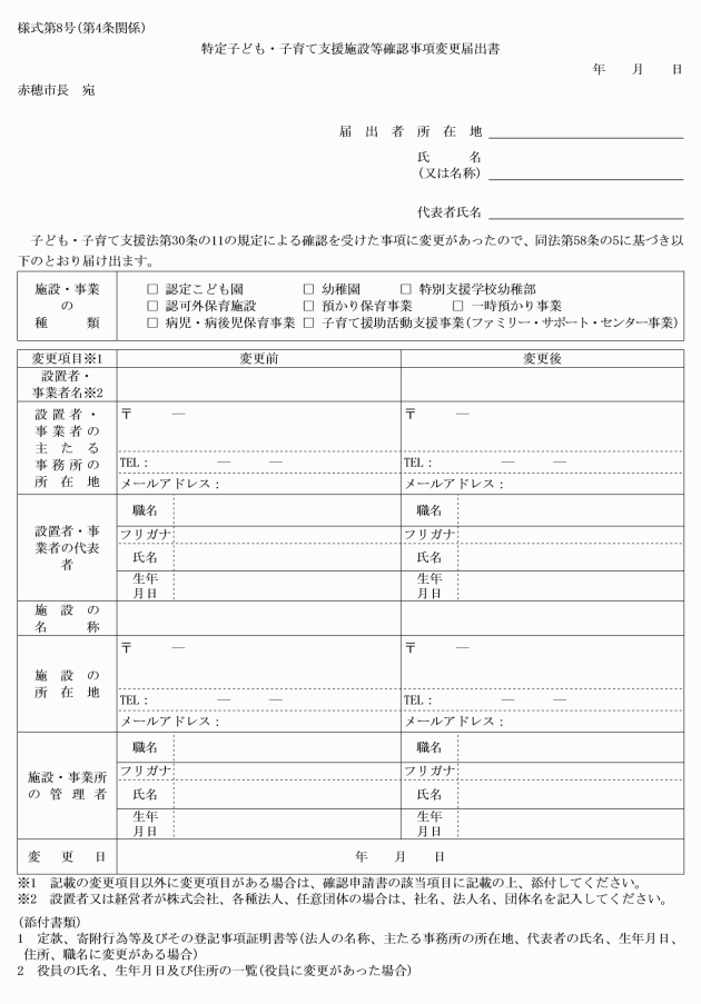 第4条 法第58条の5の規定に基づく特定子ども・子育て支援施設等の確認事項の変更の届出は、特定子ども・子育て支援施設等確認事項変更届出書(様式第8号)により行うものとする。