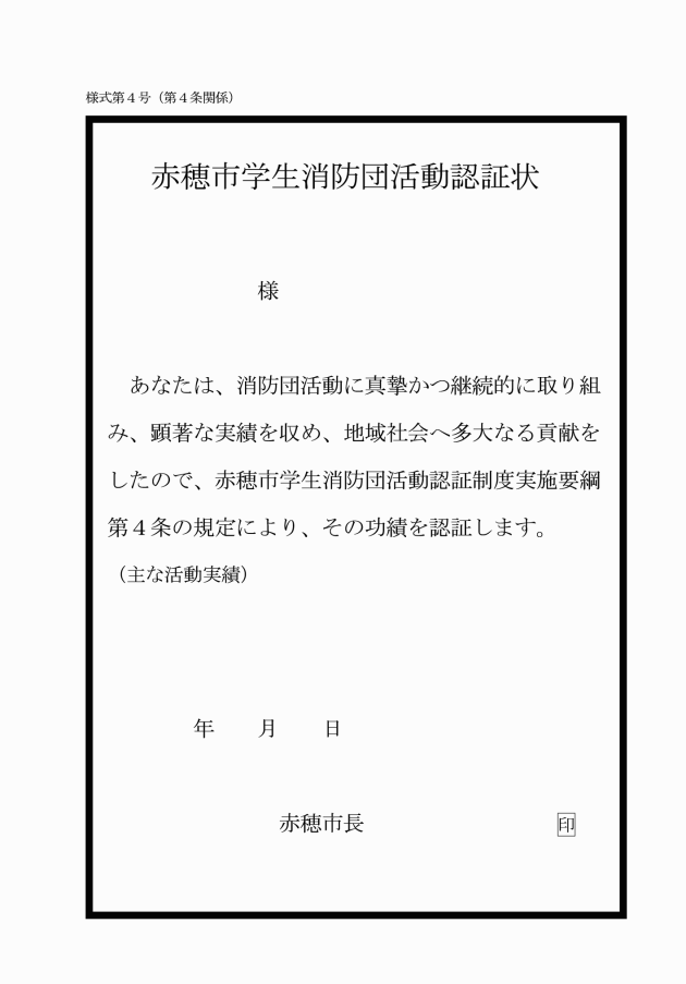 第5条 認証を受けた者(以下「被認証者」という。)は、認証を受けていることの証明を受けようとするときは、学生消防団活動認証証明書交付依頼書(様式第5号)に認証状の写しを添えて市長に提出するものとする。
