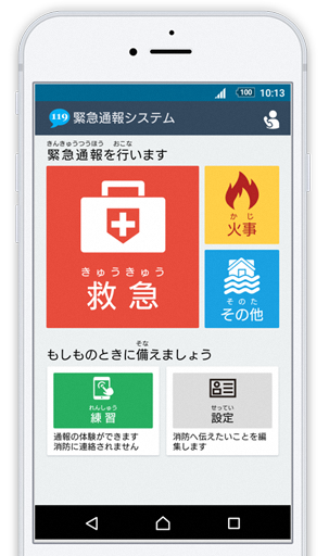 「NET119緊急通報システム」は、聴覚・言語の障がい等により音声通話が困難である方が、携帯電話等のWeb(インターネット)機能を利用して、簡単なボタン操作で119番通報を行うことができるシステムです。