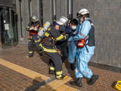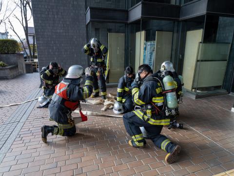 爆発(火災)が発生した建物内に進入する準備中の隊員です。空気呼吸器を着装してガス濃度を検知しながら建物内へ進入しました。